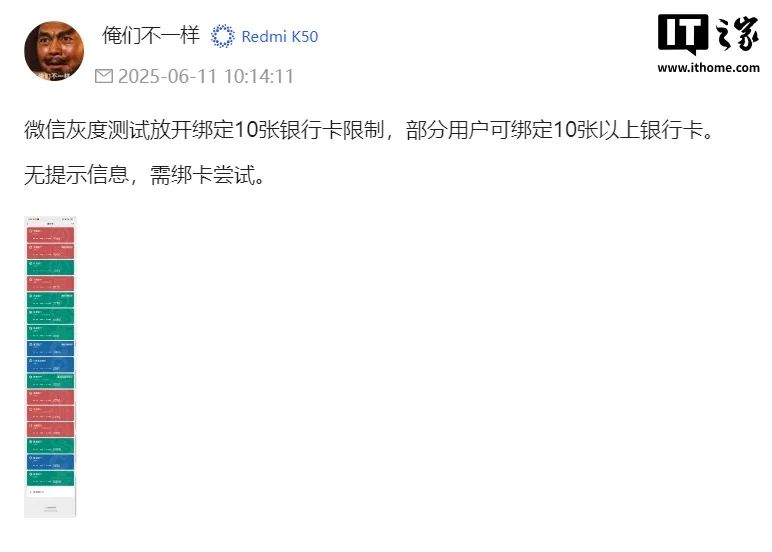 但是微信在近期解除了这一限制,被灰度到的用户可以绑定 10 张以上的银行卡。