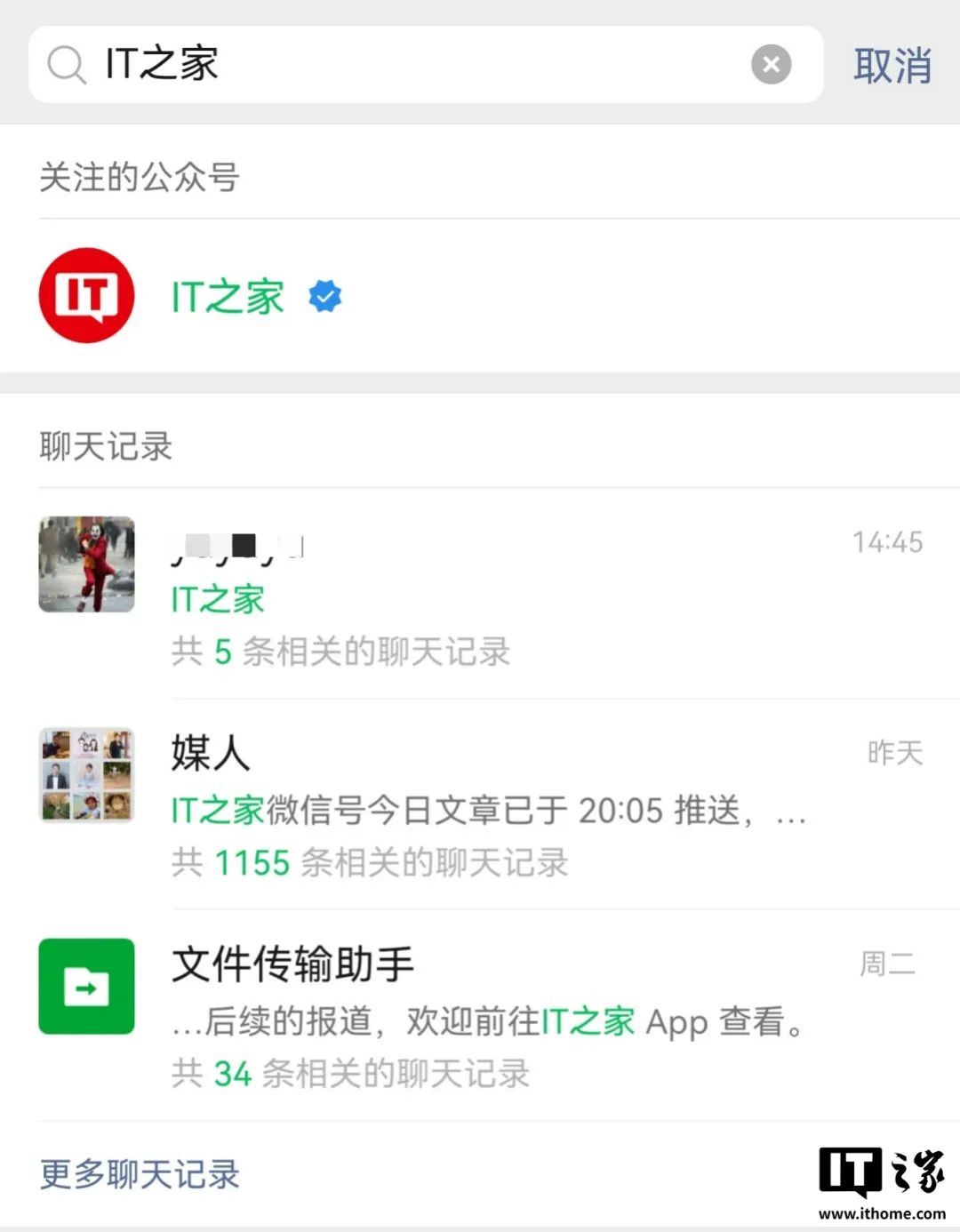 在搜索框中输入想要搜索的内容,比如“IT之家”,结果界面的聊天记录板块,新增“共 X 条相关的聊天记录”提示。