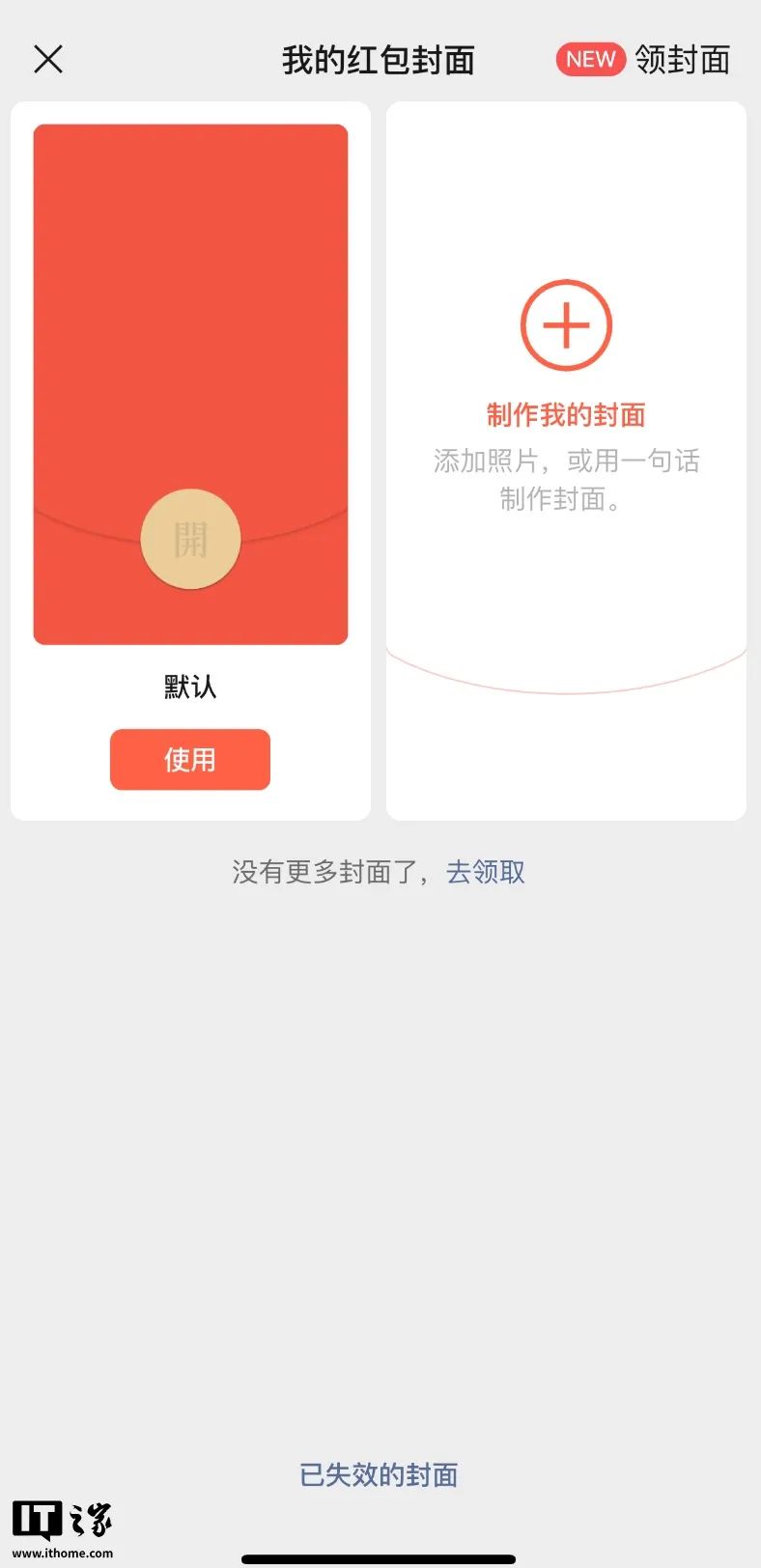 原本的界面中,右上角为“领封面”选项,下方会展示已有的红包封面。