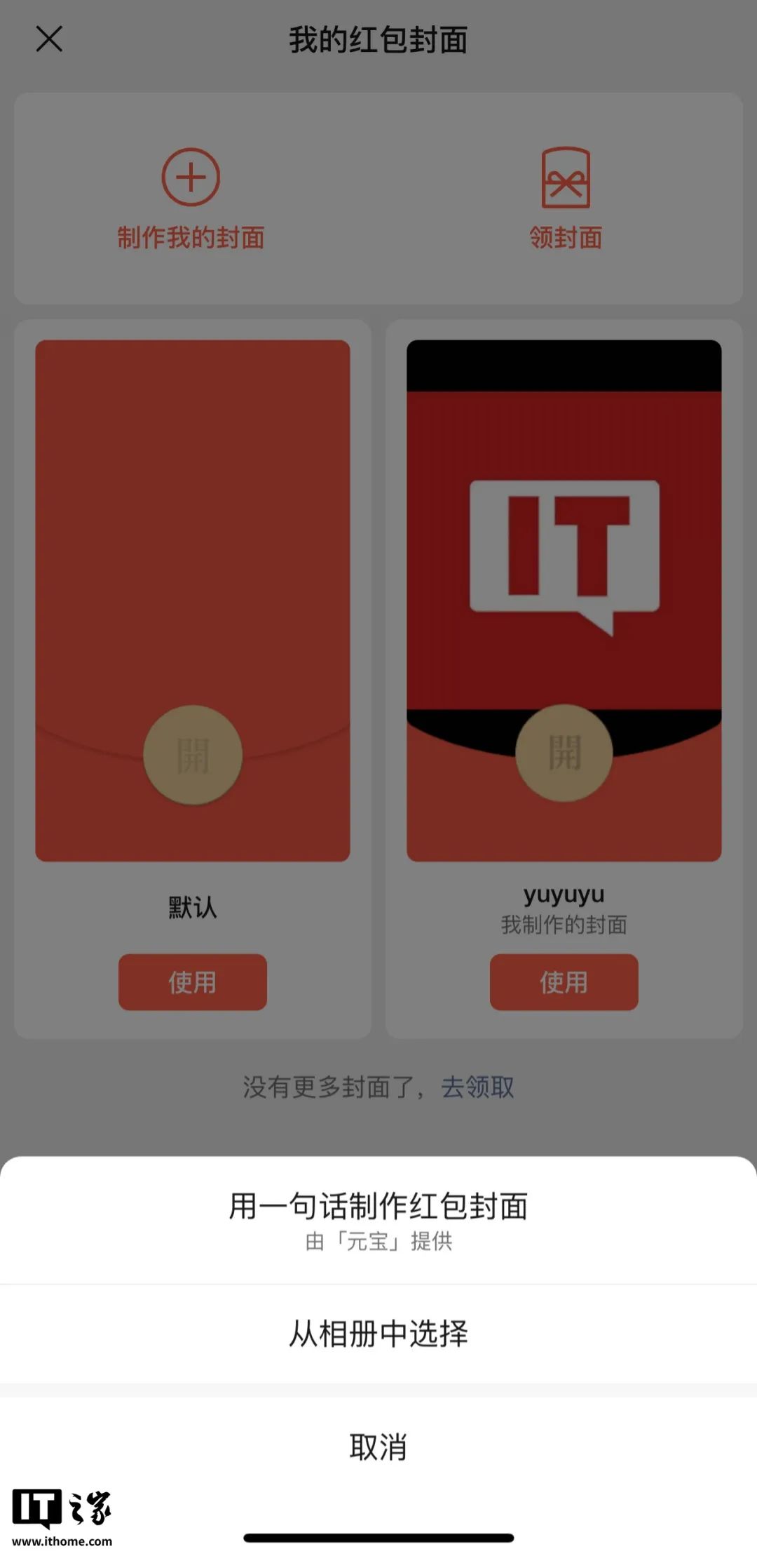 点击“制作我的封面”,则会弹出“用一句话制作红包封面”和“从相册中选择”两个选项。